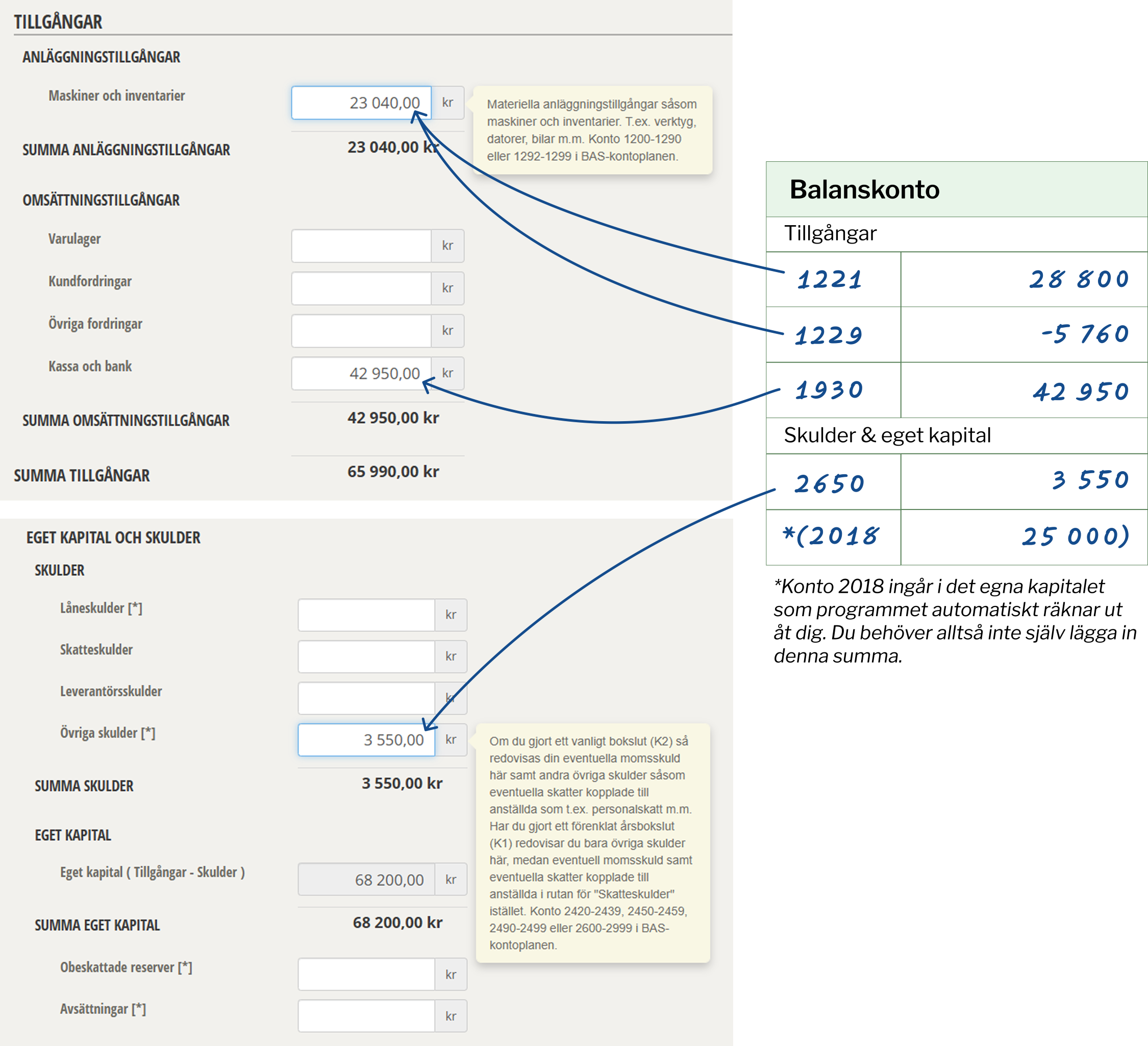 För att sedan kunna mata in dina siffror manuellt hos oss behöver du två saker: en sammanställning av hur affärerna gått (Resultaträkning) och en ögonblicksbild av vad som finns kvar i bolaget vid årets slut (Balansräkning).