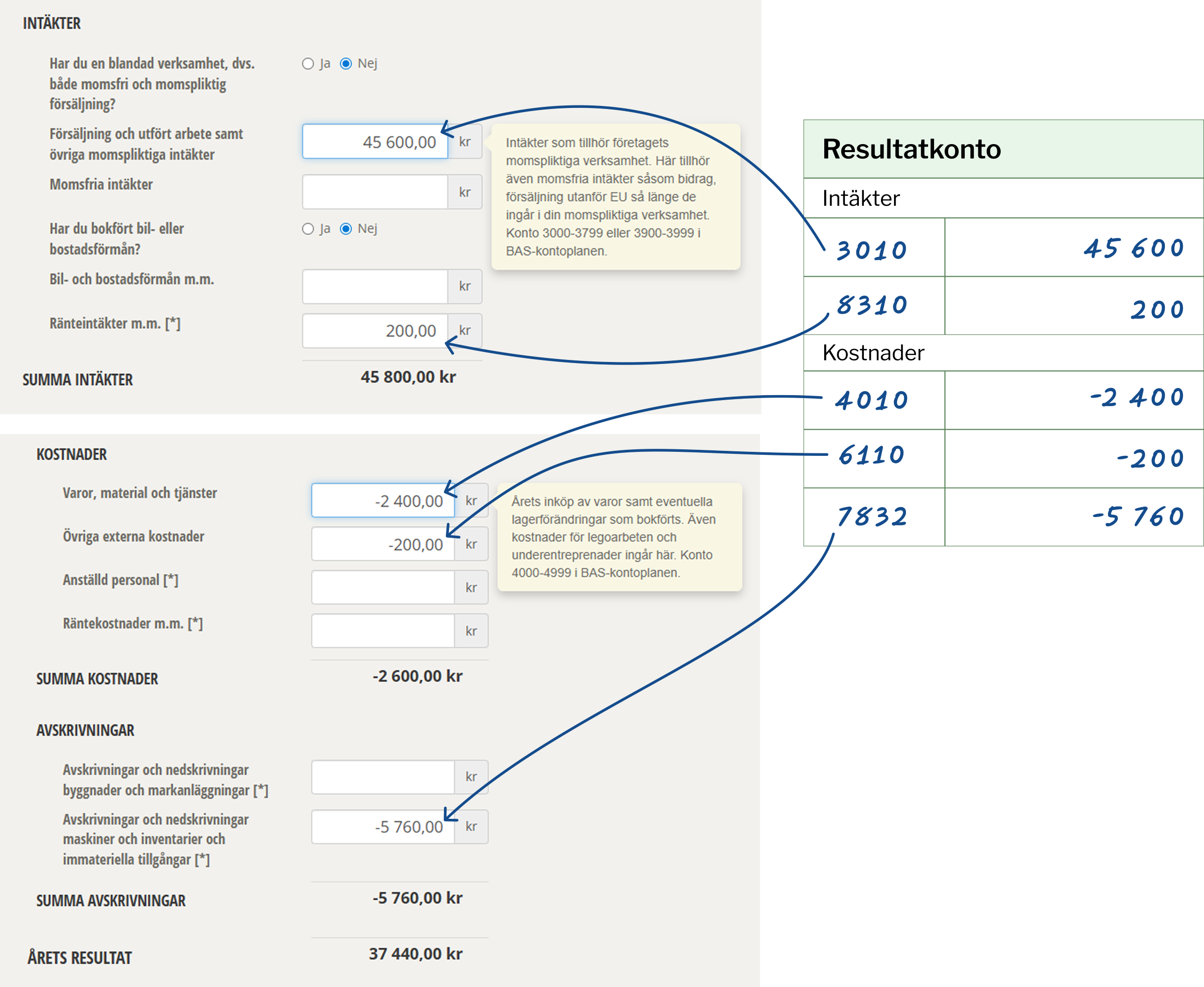 Nu när dina siffror är inlagda kan du enkelt fortsätta att följa guiden i programmet. Samtidigt hjälper vi dig tryggt genom de skattemässiga justeringarna med automatiska beräkningar och kontroller.